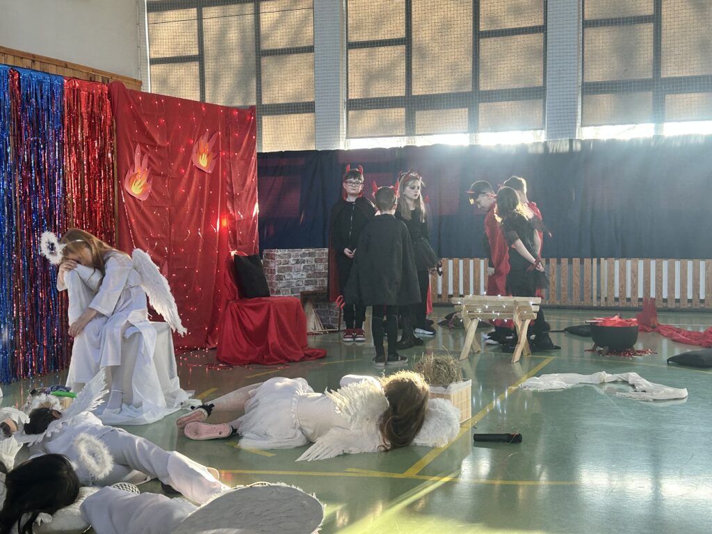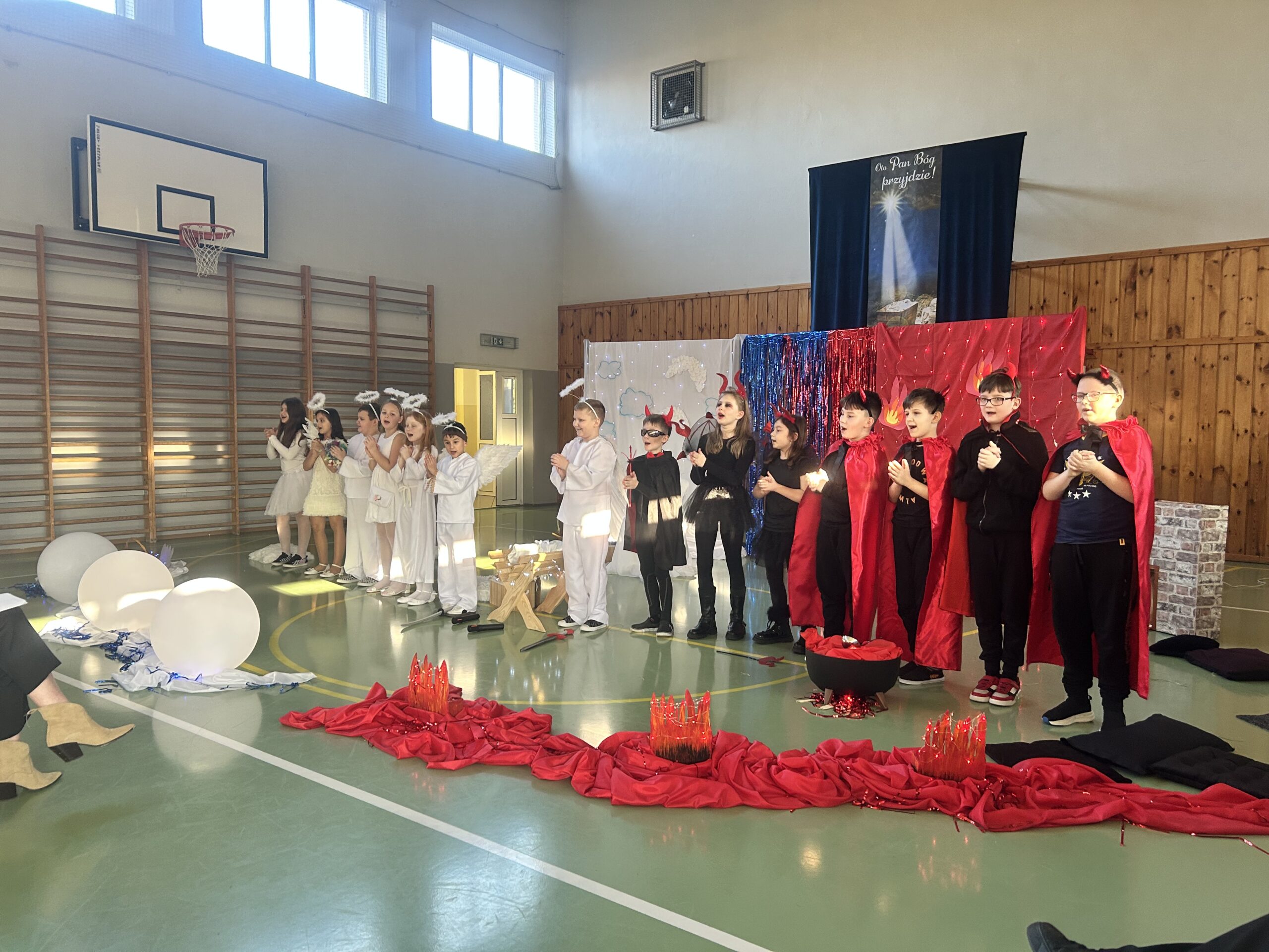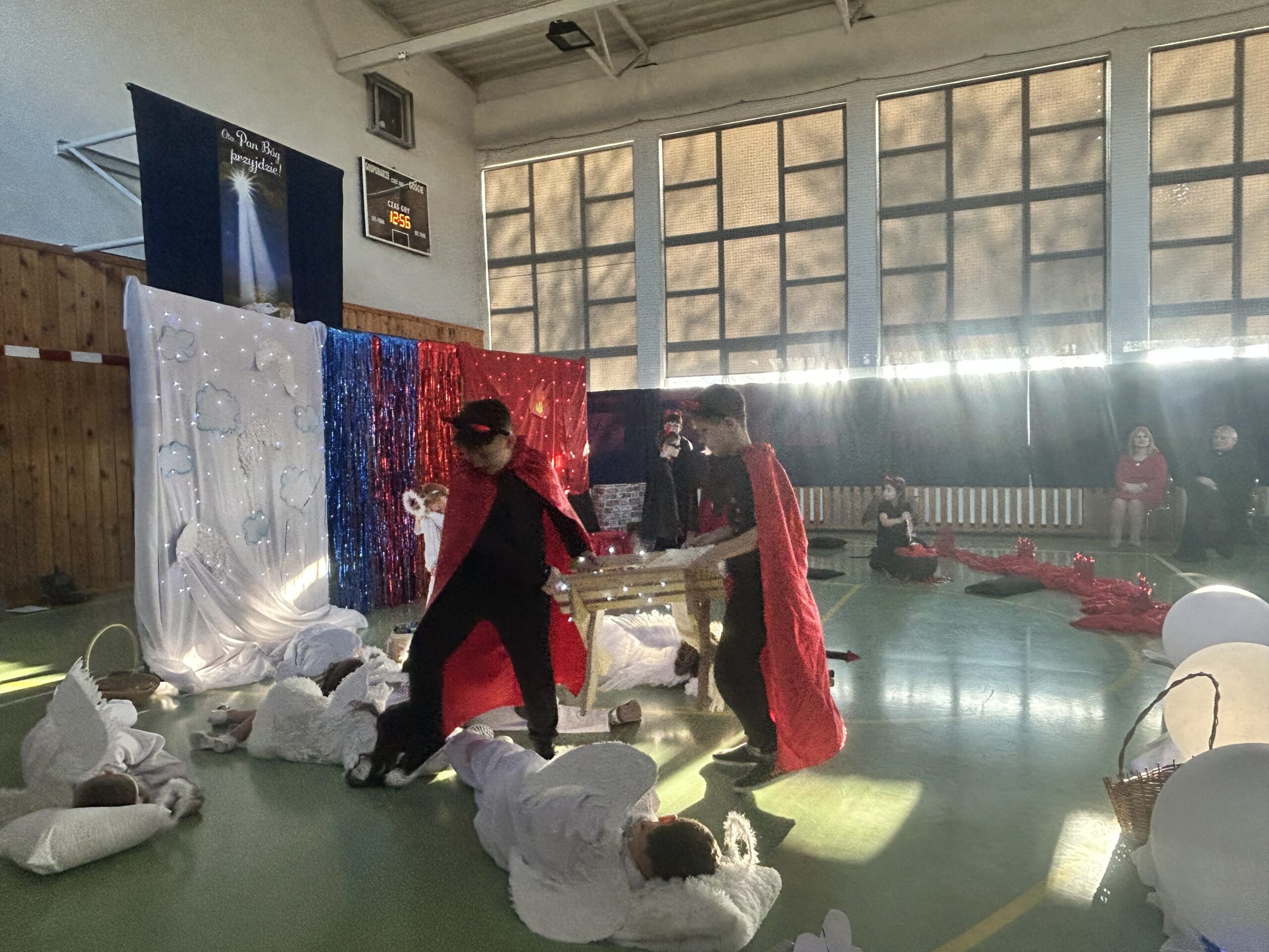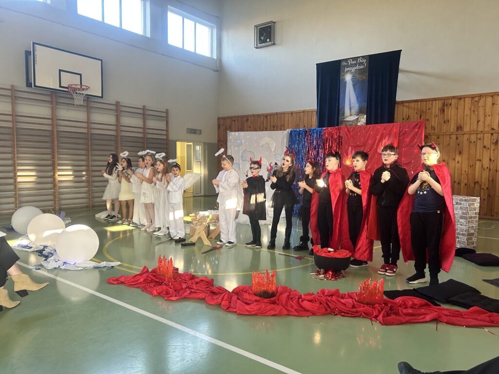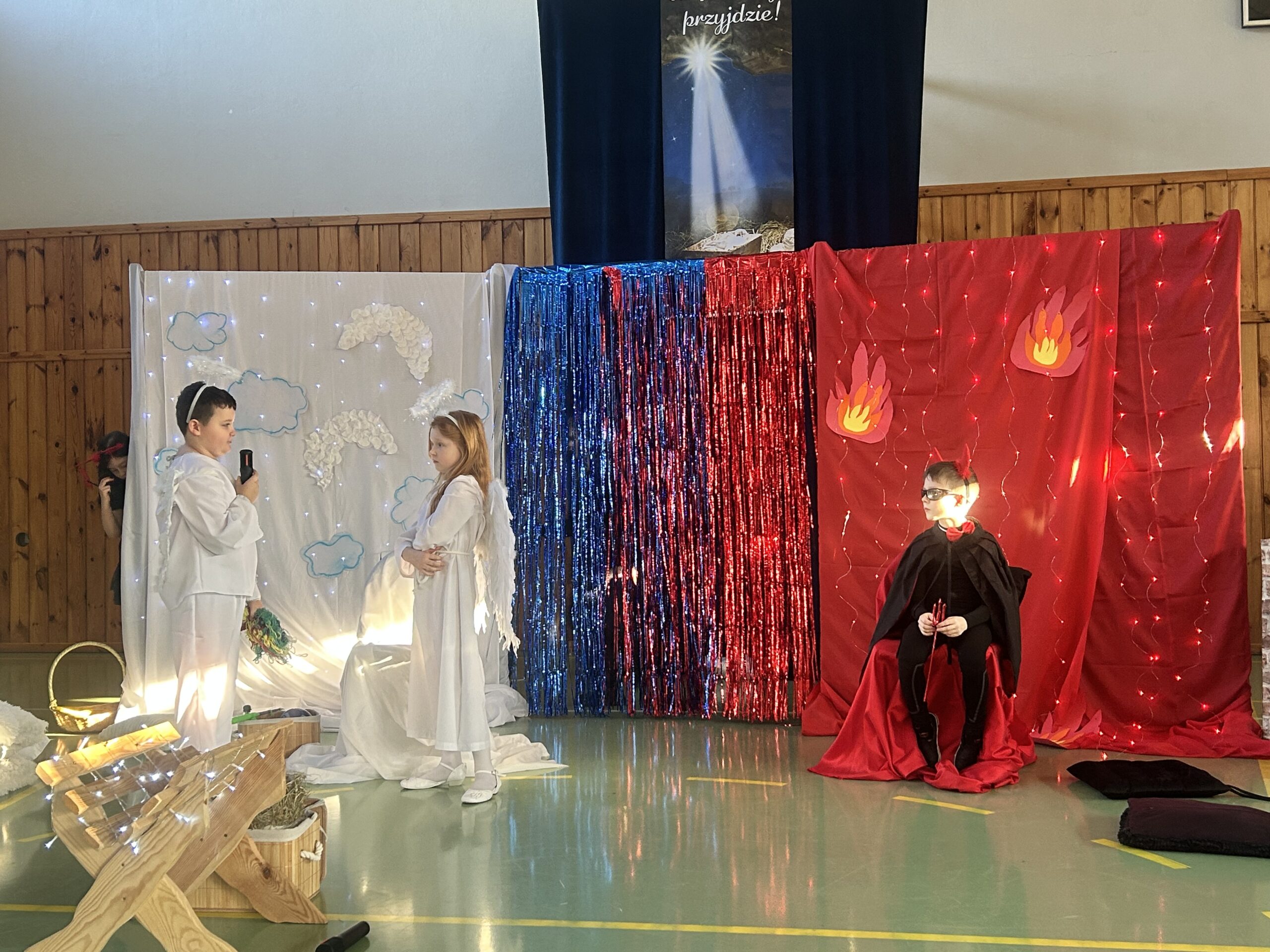 Na scenie pojawiły się anioły 👼🏻i diabły😈, Archanioł oraz sam Lucyfer. Anioły z troską patrzyły na los ludzi i zastanawiały się, jak przygotować ich serca na narodziny Jezusa ❤️. Diabły natomiast knuły, podsłuchiwały i próbowały wszystkimi sposobami przeszkodzić w przyjściu Zbawiciela. Było dużo emocji, humoru, ale też ważnych pytań o miłość, dobro, wiarę i ludzkie wybory.