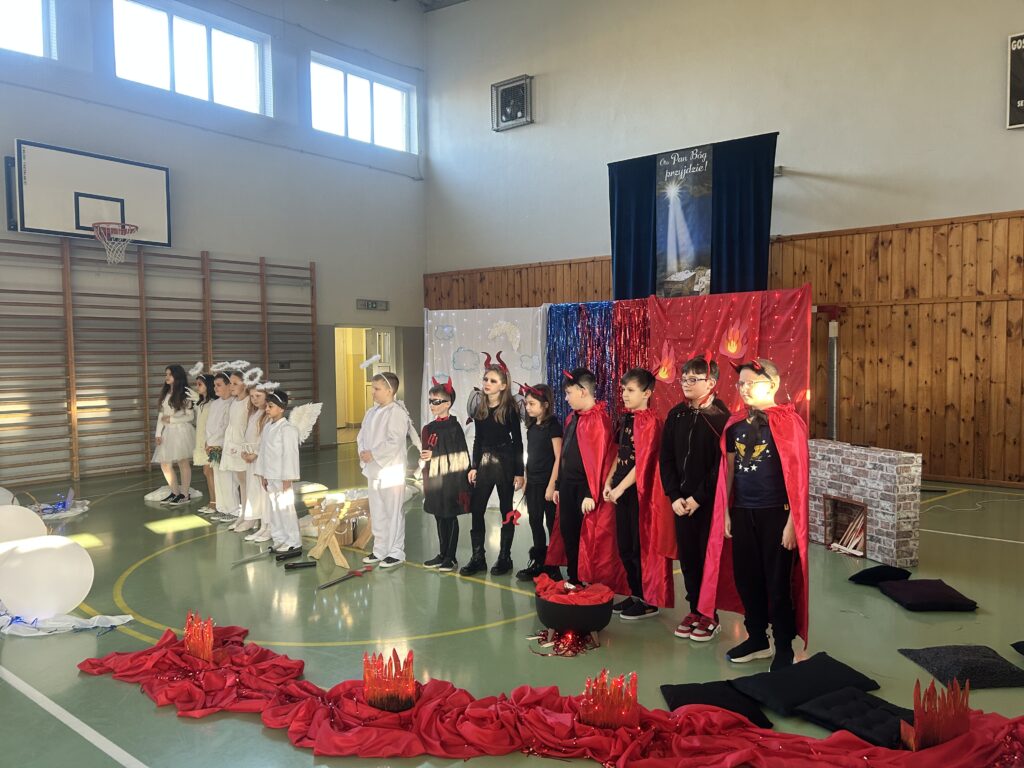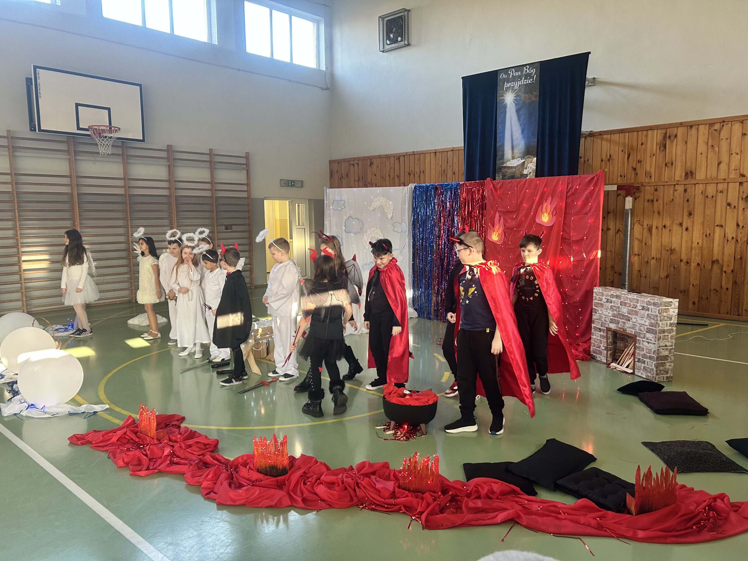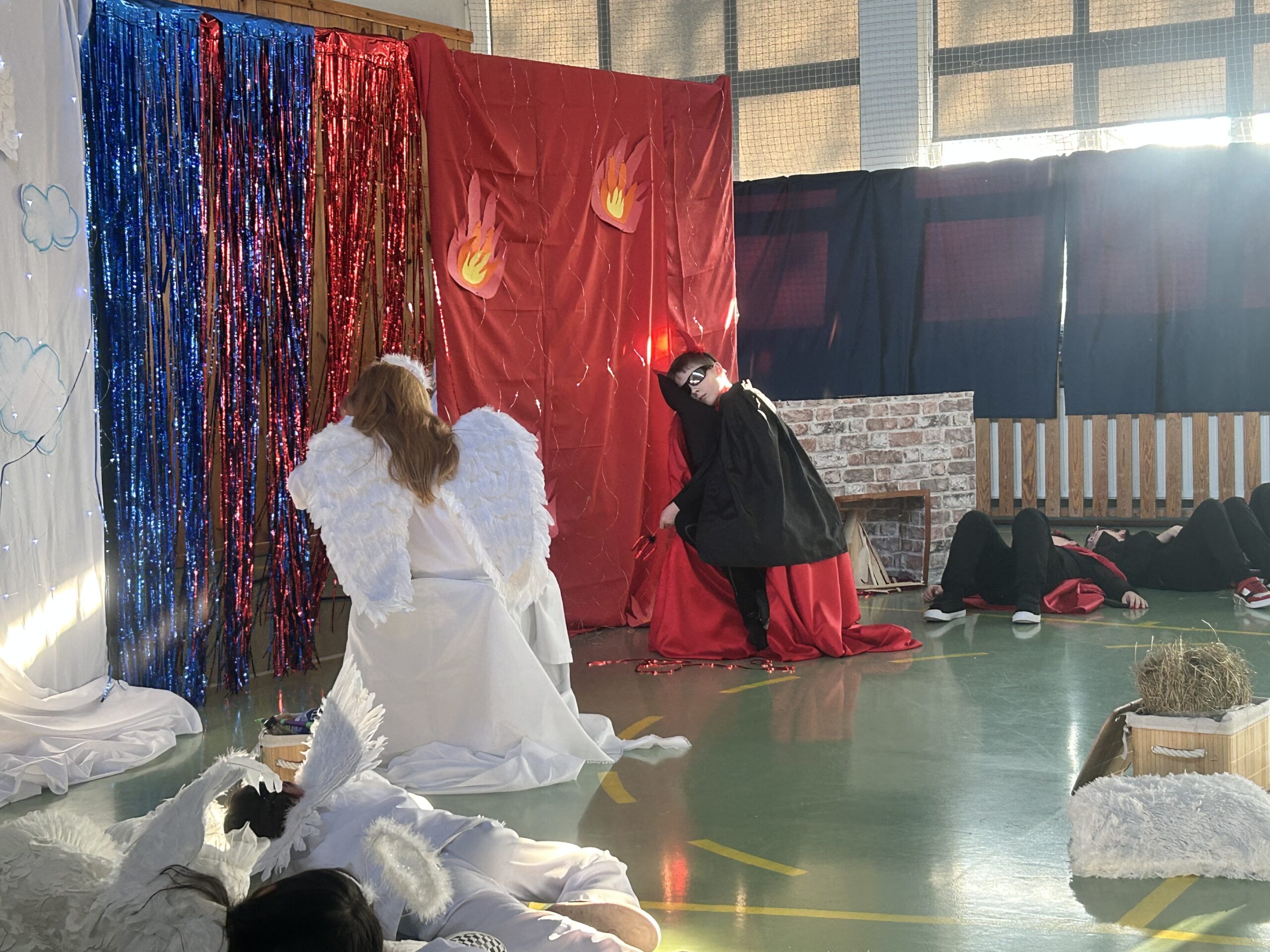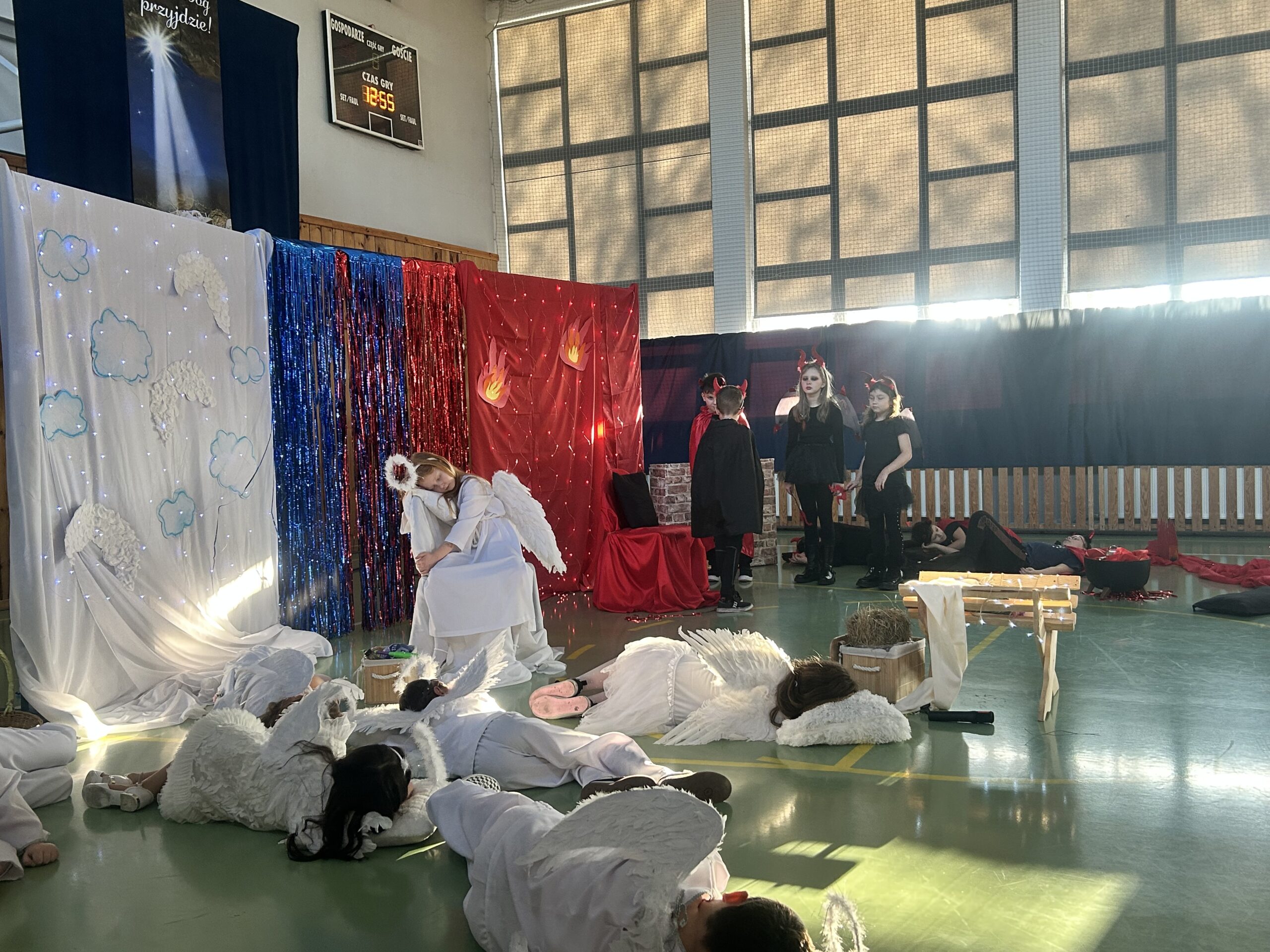 Na scenie pojawiły się anioły 👼🏻i diabły😈, Archanioł oraz sam Lucyfer. Anioły z troską patrzyły na los ludzi i zastanawiały się, jak przygotować ich serca na narodziny Jezusa ❤️. Diabły natomiast knuły, podsłuchiwały i próbowały wszystkimi sposobami przeszkodzić w przyjściu Zbawiciela. Było dużo emocji, humoru, ale też ważnych pytań o miłość, dobro, wiarę i ludzkie wybory.