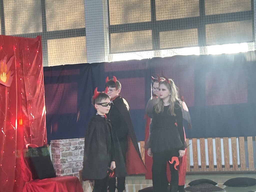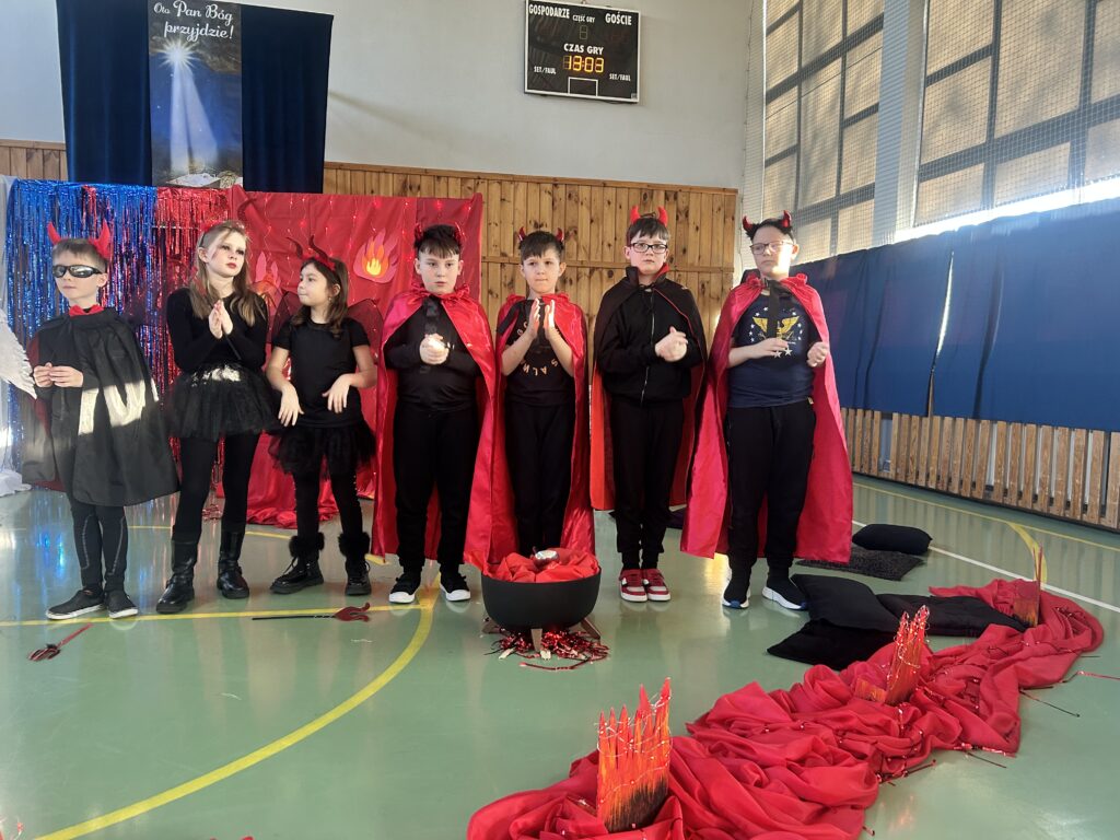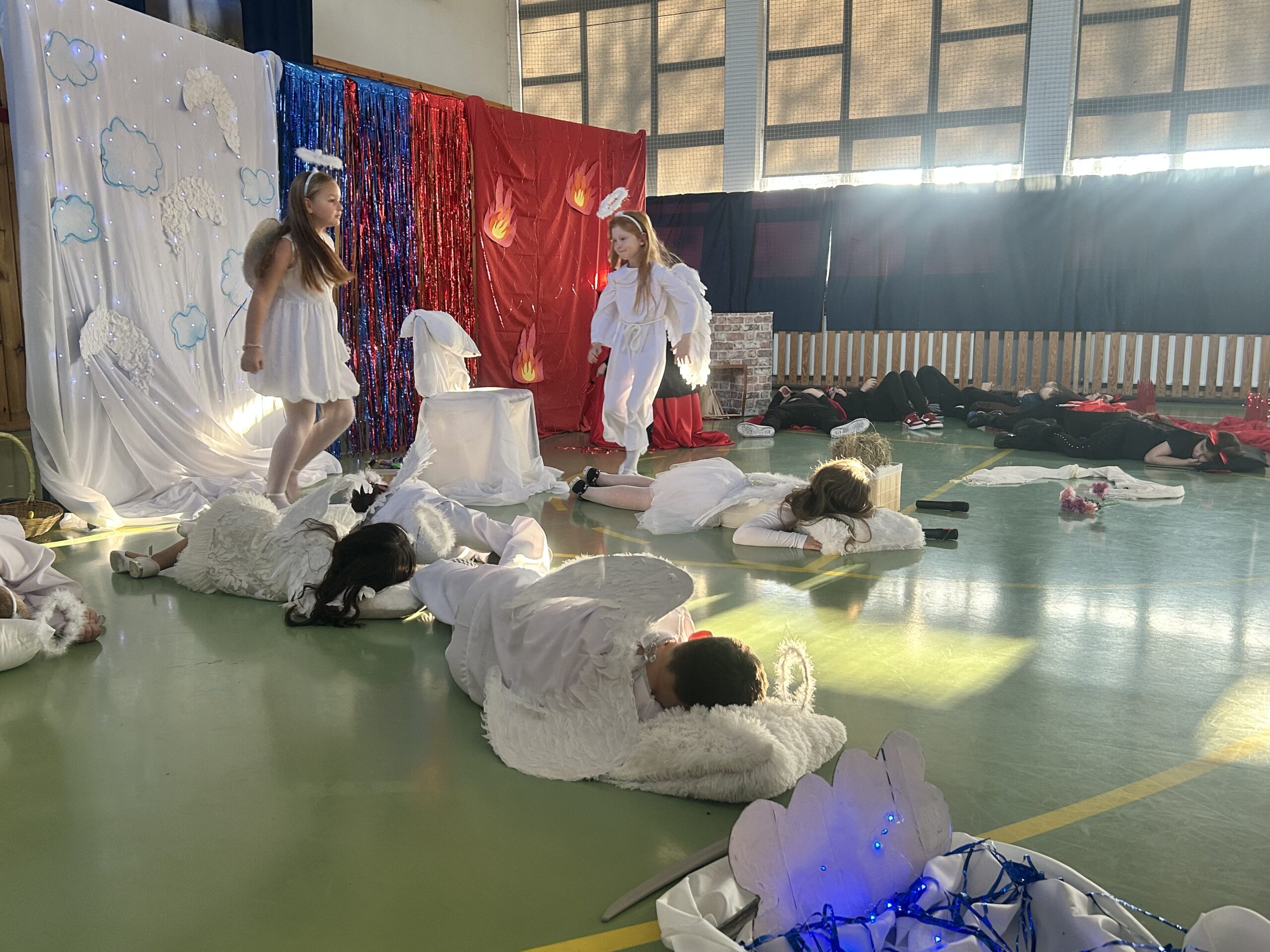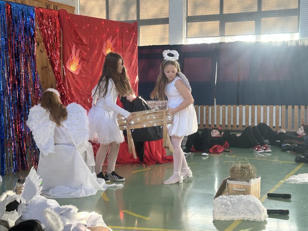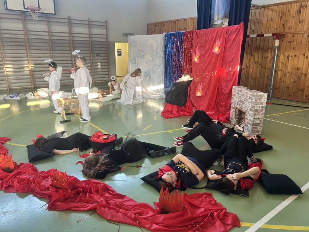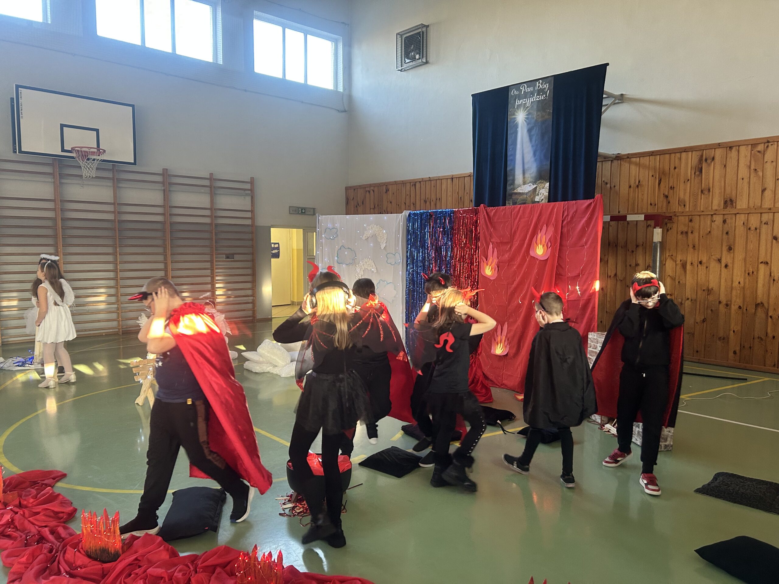 Na scenie pojawiły się anioły 👼🏻i diabły😈, Archanioł oraz sam Lucyfer. Anioły z troską patrzyły na los ludzi i zastanawiały się, jak przygotować ich serca na narodziny Jezusa ❤️. Diabły natomiast knuły, podsłuchiwały i próbowały wszystkimi sposobami przeszkodzić w przyjściu Zbawiciela. Było dużo emocji, humoru, ale też ważnych pytań o miłość, dobro, wiarę i ludzkie wybory.