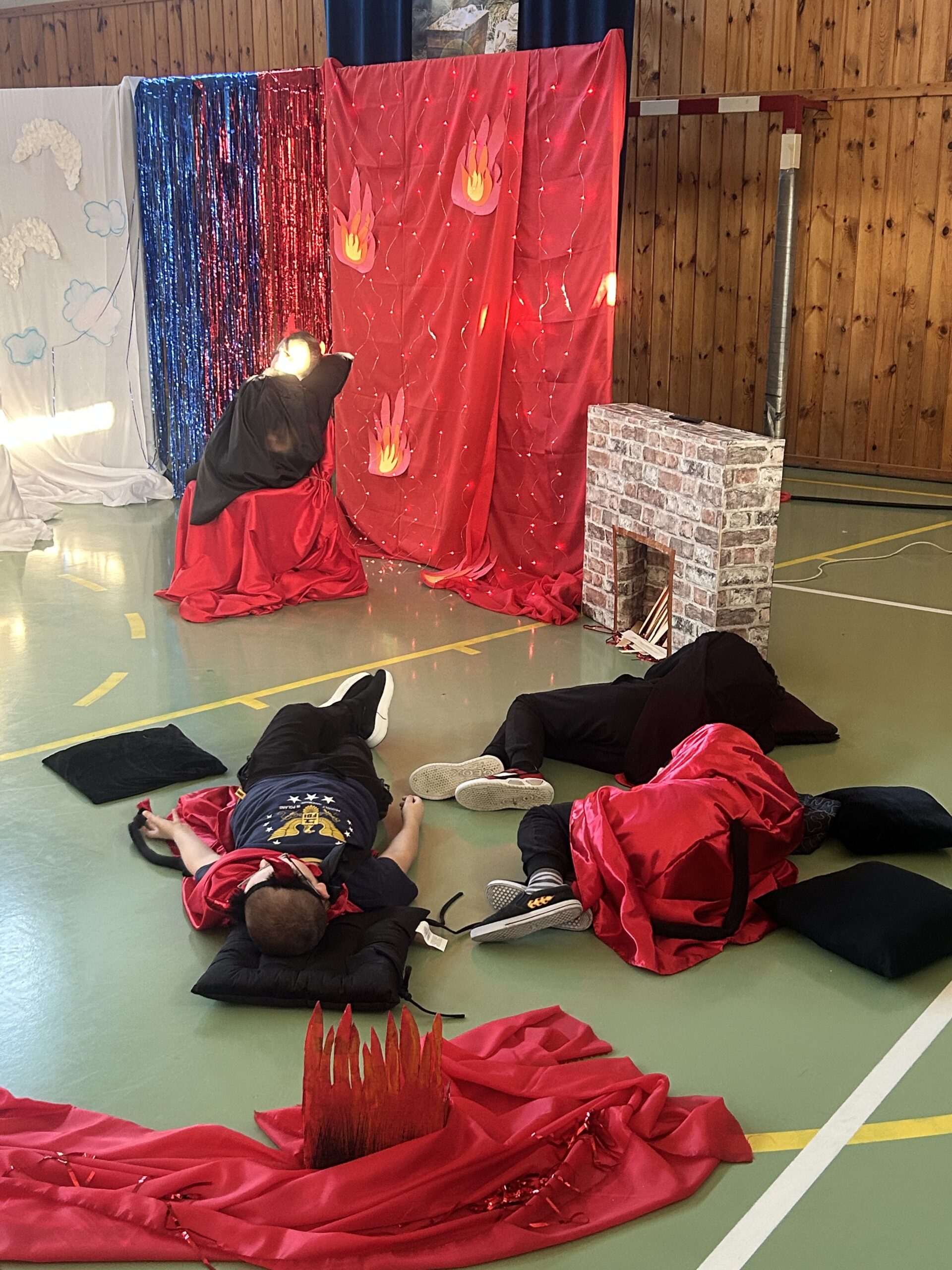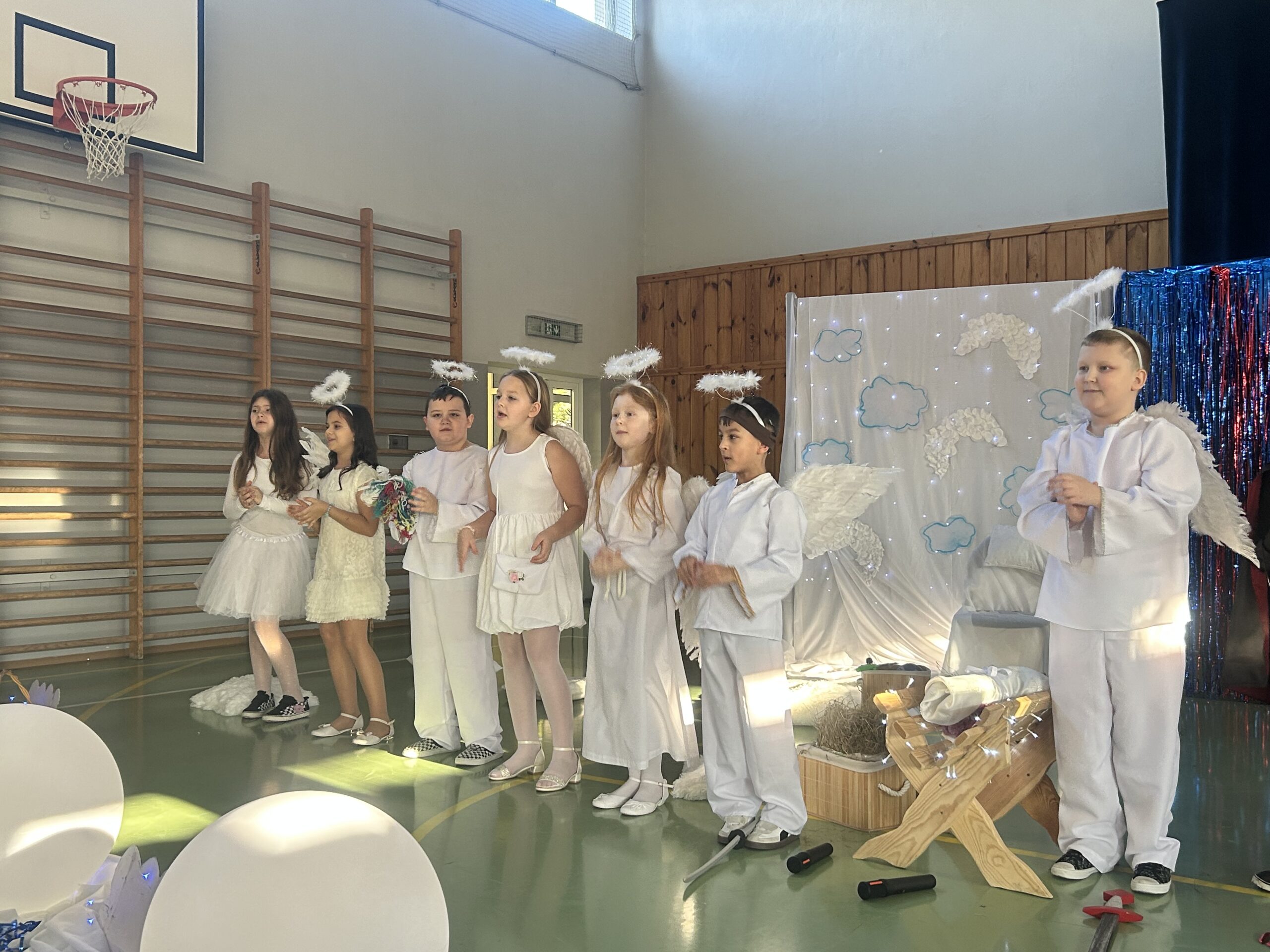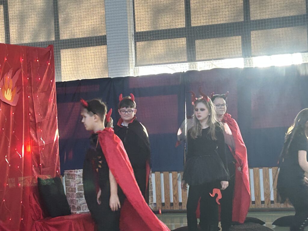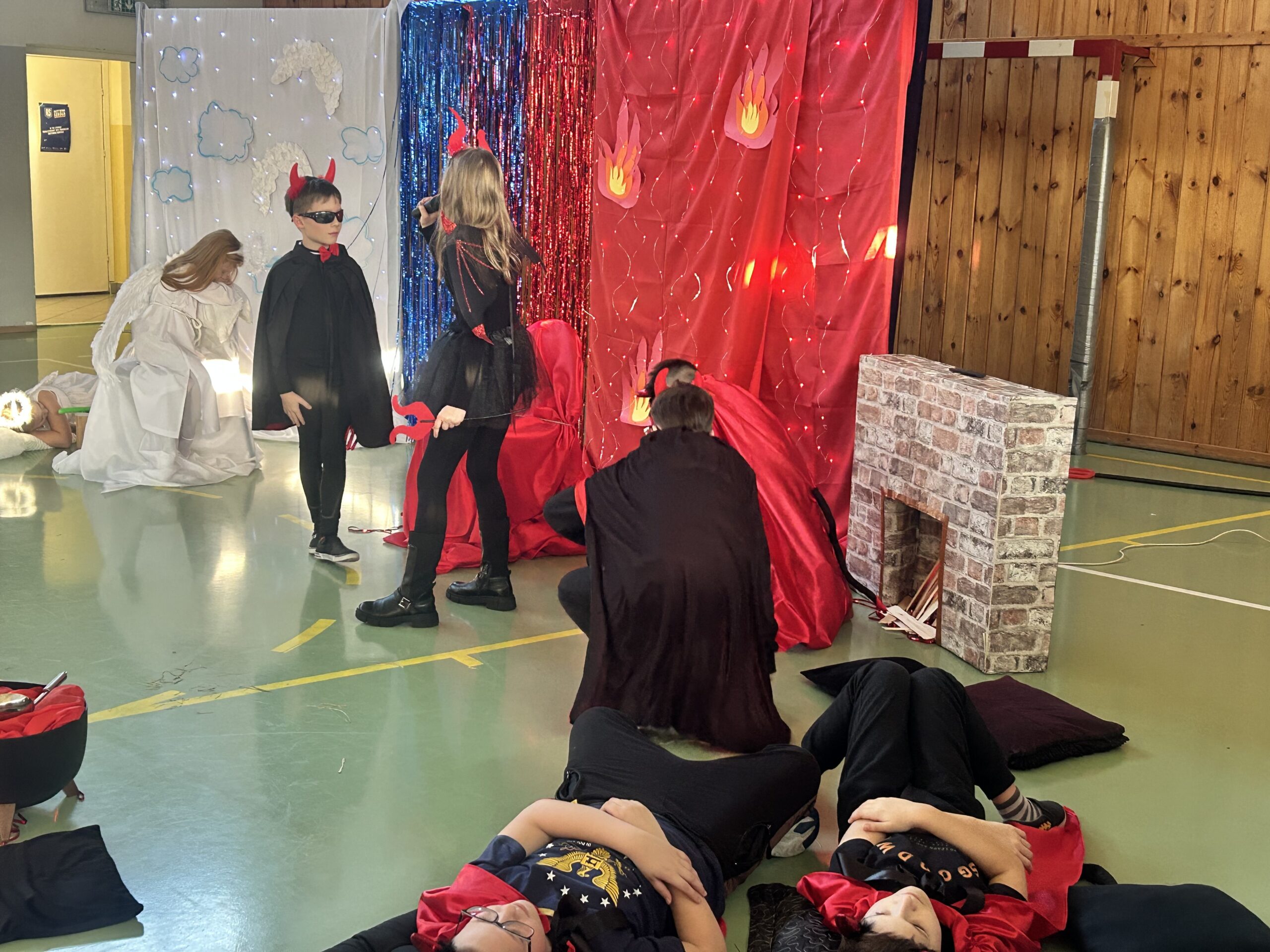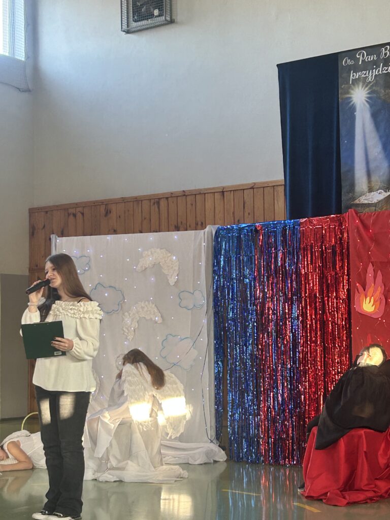 Na scenie pojawiły się anioły 👼🏻i diabły😈, Archanioł oraz sam Lucyfer. Anioły z troską patrzyły na los ludzi i zastanawiały się, jak przygotować ich serca na narodziny Jezusa ❤️. Diabły natomiast knuły, podsłuchiwały i próbowały wszystkimi sposobami przeszkodzić w przyjściu Zbawiciela. Było dużo emocji, humoru, ale też ważnych pytań o miłość, dobro, wiarę i ludzkie wybory.