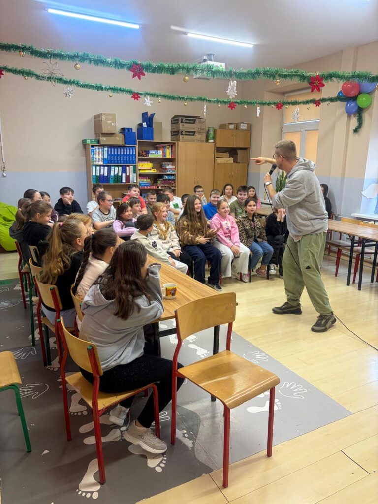 Całe spotkanie przeplatało się z freestylem, którym Mikser zajmuje się na co dzień. Ten element zrobił na uczniach ogromne wrażenie 🎤! Dzieci były zafascynowane zarówno tematyką warsztatów, jak i umiejętnościami gościa 🎶. Chętnie zadawały pytania, a Mikser z wielką otwartością na nie odpowiadał 🫶🏻.
