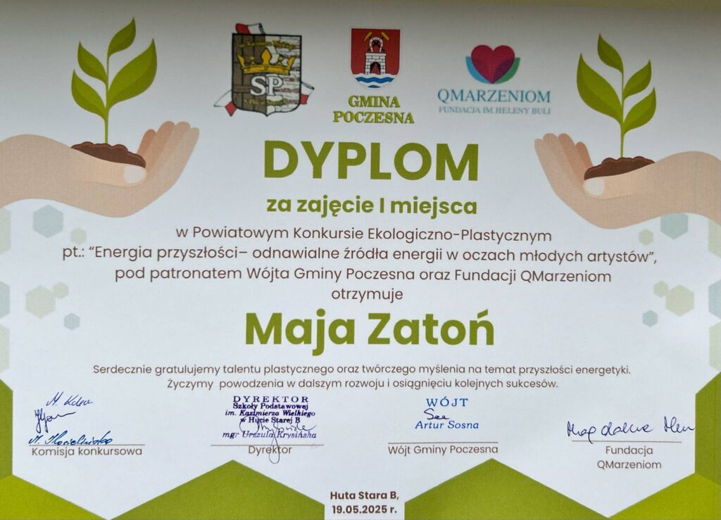 pt. „Energia przyszłości- odnawialne źródła energii w oczach młodych artystów” pod patronatem Wójta Gminy Poczesna oraz Fundacji QMarzeniom.