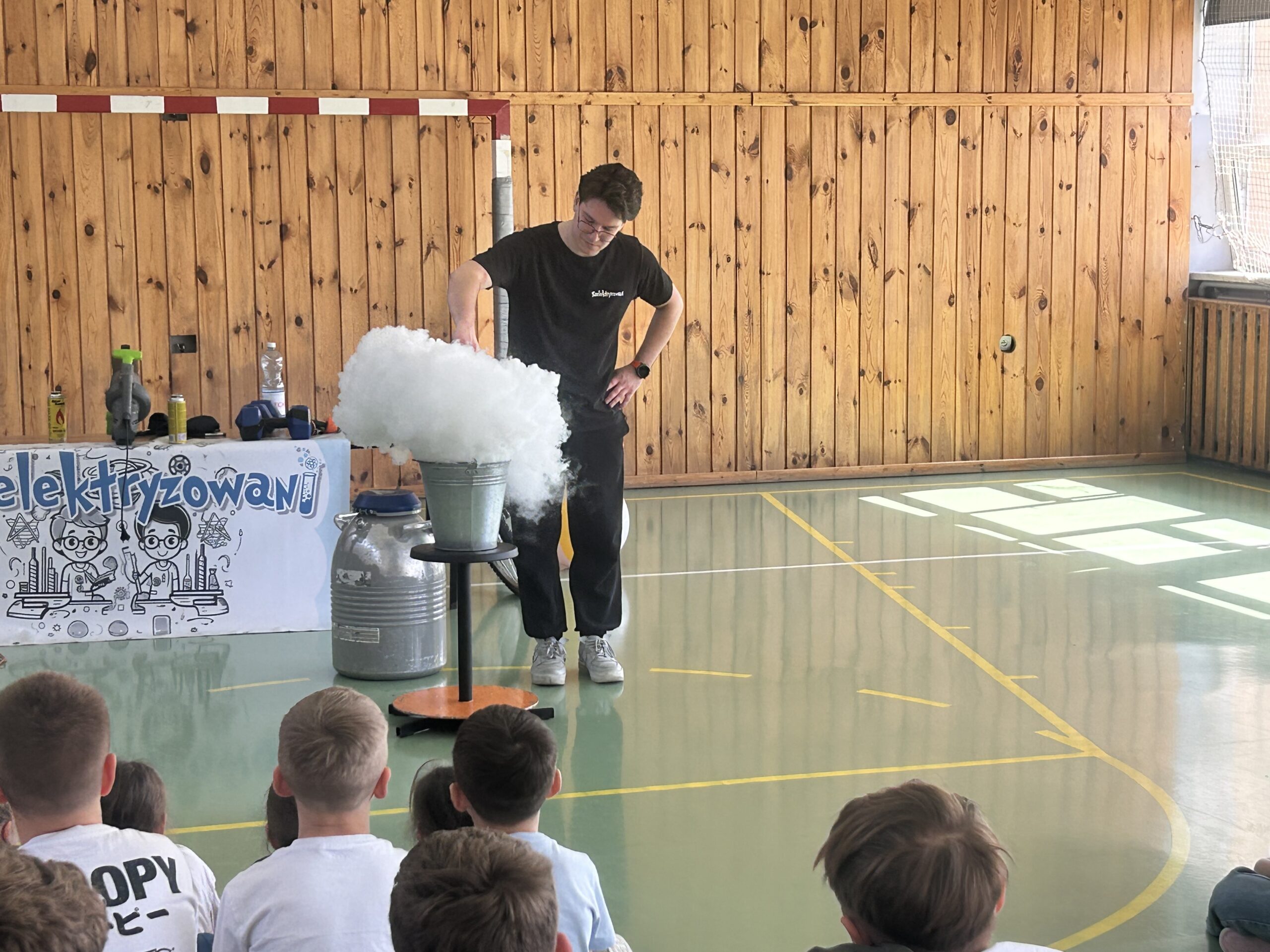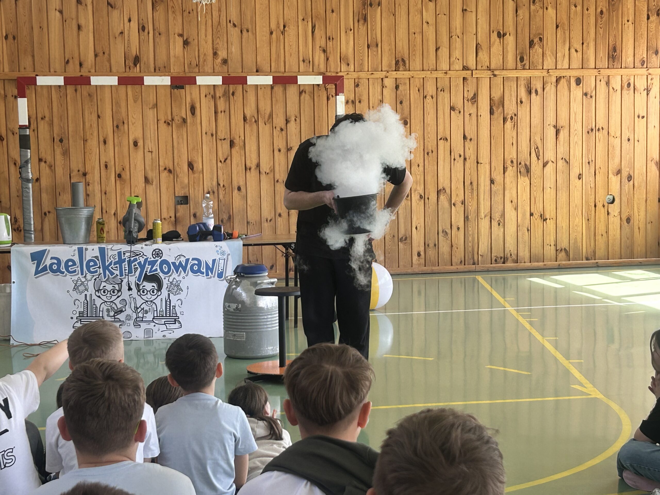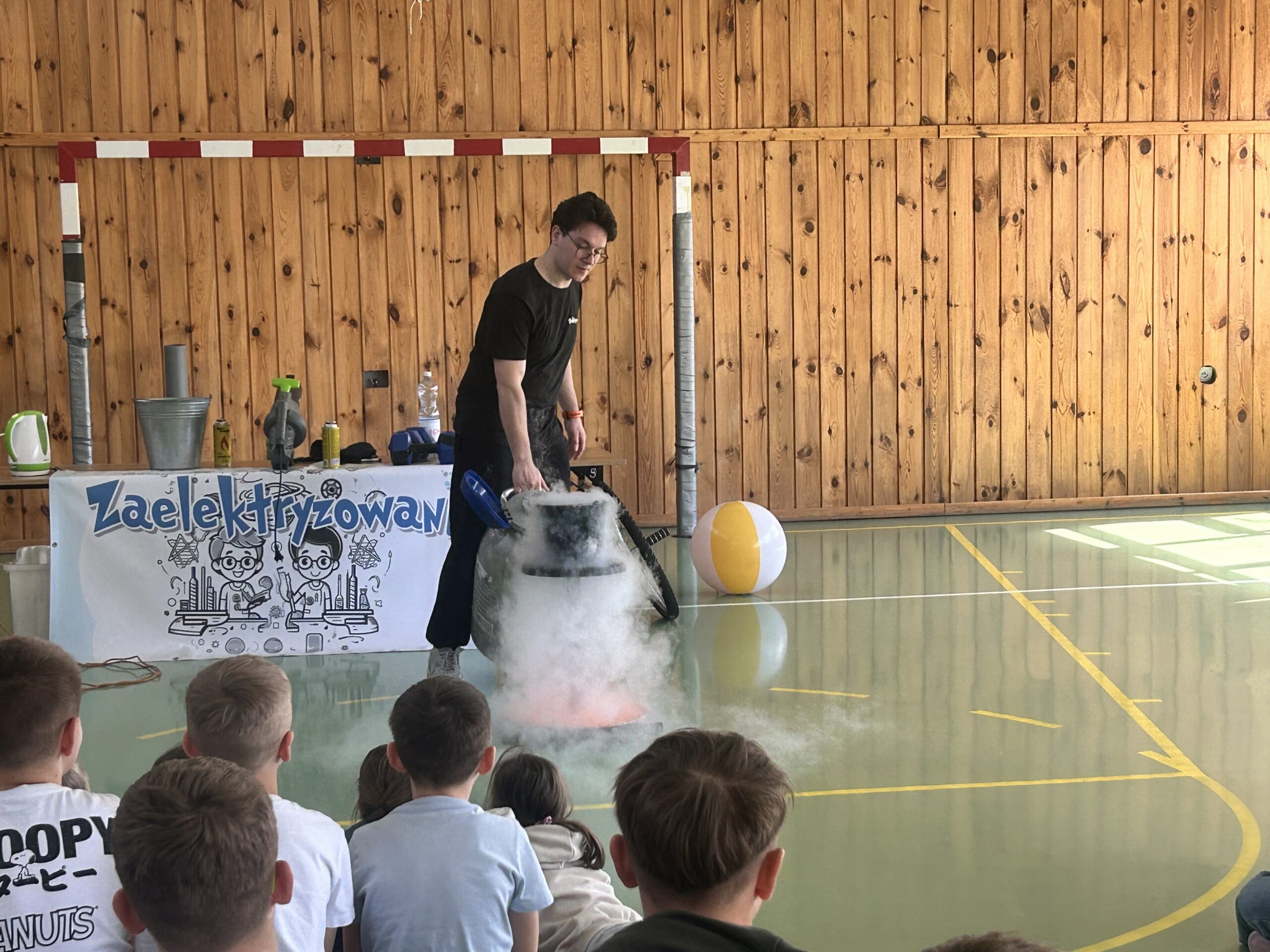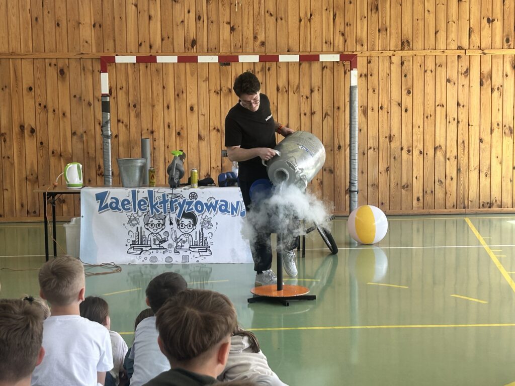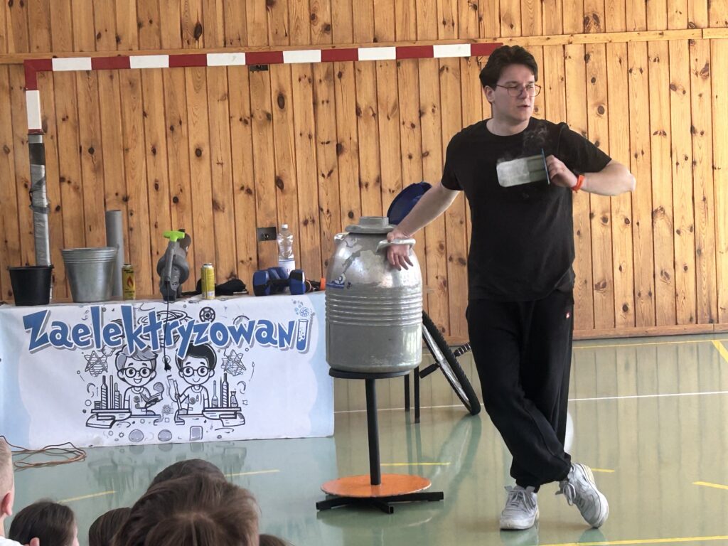 Warsztaty „Zaelektryzowani” to niezwykłe zajęcia, podczas których uczniowie mogli odkrywać fascynujący świat nauki poprzez efektowne doświadczenia z ogniem, powietrzem czy ciekłym azotem. Prowadzący zaprezentował szereg widowiskowych eksperymentów, które wzbudziły ogromne zainteresowanie i zachwyt uczestników 😮. Szczególne emocje towarzyszyły pokazom z wykorzystaniem ciekłego azotu, które w spektakularny sposób ukazały właściwości bardzo niskich temperatur.