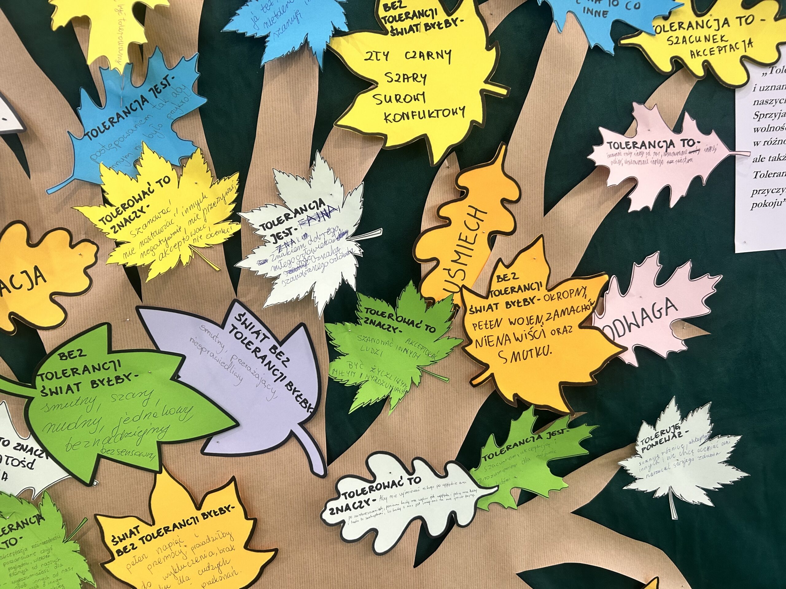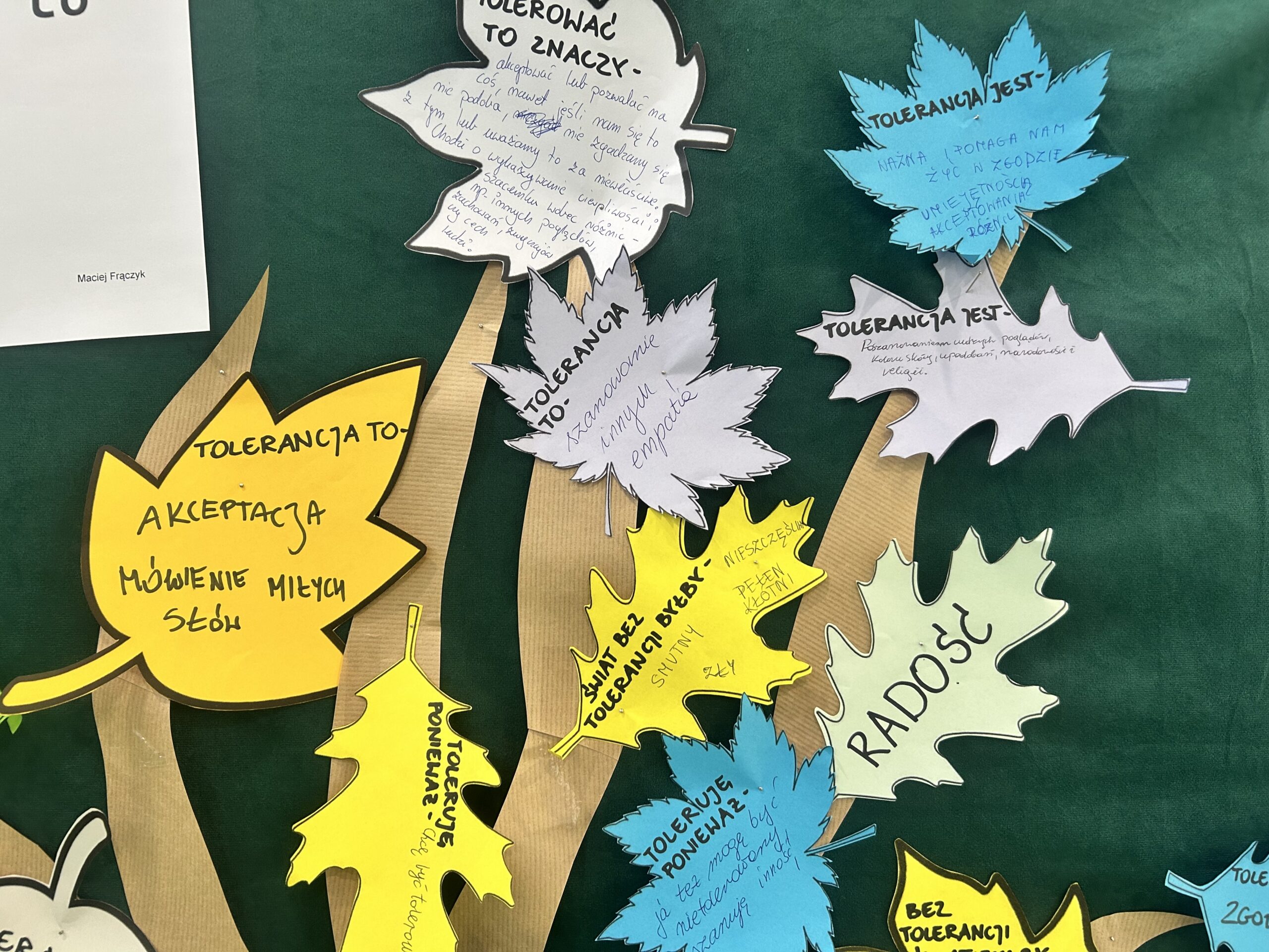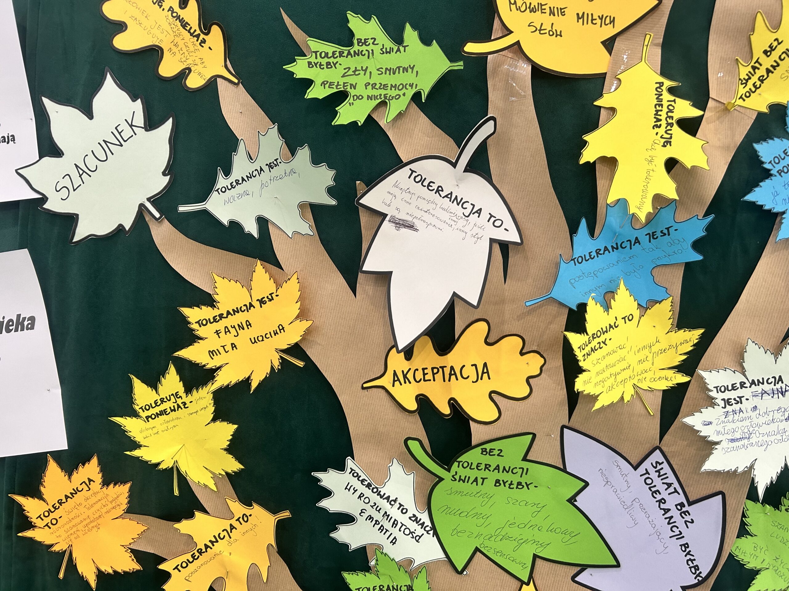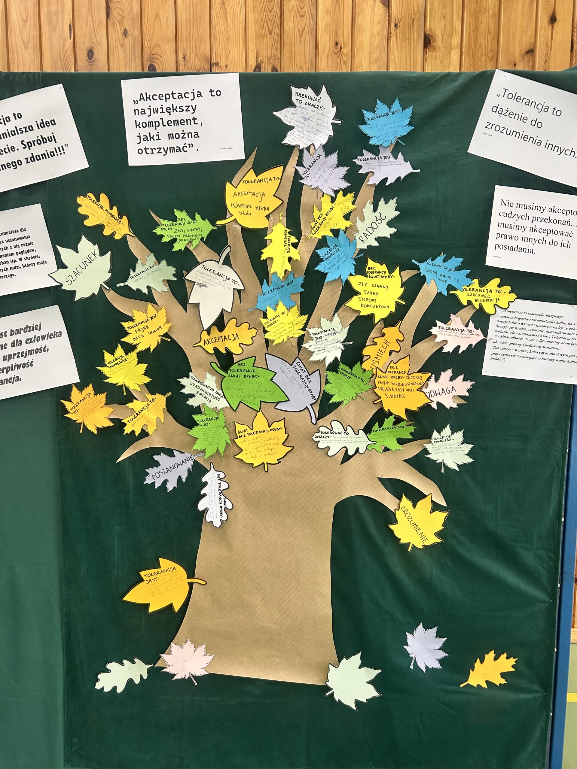 W ramach obchodów tego wyjątkowego dnia uczniowie uczestniczyli w zajęciach poświęconych empatii i wyrozumiałości 💚. Na szkolnym korytarzu pojawiło się „drzewo tolerancji”, na którym pojawiły się hasła promujące akceptację i równość 👩🏾‍🦰👨🏿👩🏽‍🦱👧🏻👧 .