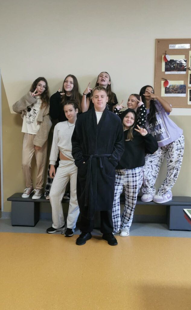 Tego dnia korytarze i sale lekcyjne wypełniły się kolorowymi piżamami, szlafrokami i pluszakami 🧸. Uczniowie i nauczyciele chętnie włączyli się w akcję, by w symboliczny sposób okazać solidarność z dziećmi przebywającymi na oddziałach onkologicznych 🩺. Piżama, będąca codziennym strojem małych pacjentów, stała się znakiem empatii, wsparcia i zrozumienia 👊🏻.